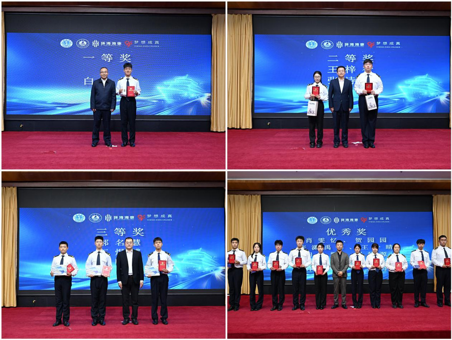 “启航新程,邮轮逐梦”演讲比赛一、二等奖学生登台进行成果汇报,与会领导为获奖学子颁发证书及奖品。