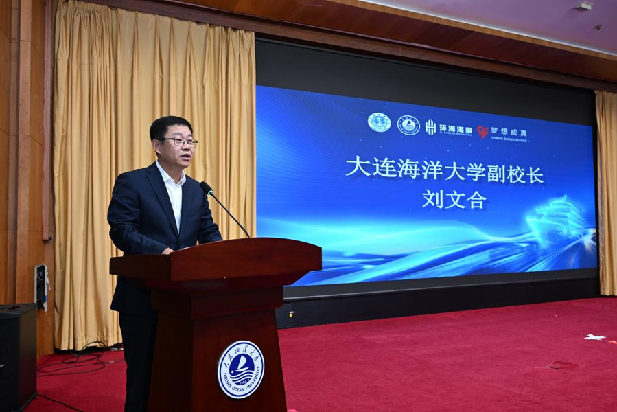 仪式上,刘文合首先代表学校对到场的各位领导和嘉宾表示热烈欢迎。他表示,大连海洋大学自建校以来,始终以“服务海洋强国战略、助力地方经济发展”为己任,在航海技术、轮机工程、船舶与海洋工程等相关专业领域,培养了大批扎根海洋、服务行业的优秀人才。他指出,启航计划是一次政校企深度携手、行业协同发展的重要实践,更是我校响应国家邮轮产业高质量发展号召、精准对接行业人才需求的关键举措。相信在各方的共同努力下,“启航计划”一定能够成为豪华邮轮人才培养的优质品牌,为我国邮轮产业高质量发展输送更多优秀的专业人才。