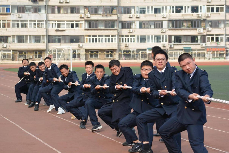 活动在庄严的国歌声中开始,旗语方阵率先亮相,学生手持彩旗,以整齐划一的动作精准传递信号指令,既呼应“旗语通信”技能需求,更凸显准军事化管理下“令行禁止”的纪律意识。随后女生们用舞蹈展现了严格管理中学生的青春风采与全面发展素养。在队列比武环节,各参赛队员身着统一藏青色航船制服,以铿锵步伐、嘹亮口号完成立正、稍息、齐步走等动作。摆臂高度一致、步幅精准规范,从基础定型到转向看齐,每个细节都凝聚着日常训练成果。叠被子比武中,学生们将棉被在规定时间内叠出棱角分明、平整方正的标准军被,以“小切口”展现准军事化管理“以小见大”的育人理念,强化学生严谨细致的生活作风。拔河比赛将氛围推向高潮。各专业代表队紧握麻绳、协同发力,观众“一二!拉!”“加油!顶住!”的呐喊声响彻操场,充分彰显准军事化管理下“团结协作、敢打硬仗”的集体凝聚力。经评审,活动评选出队列评比一、二、三等奖及精神文明奖,被子叠放先进个人奖,拔河比赛专业优胜奖。